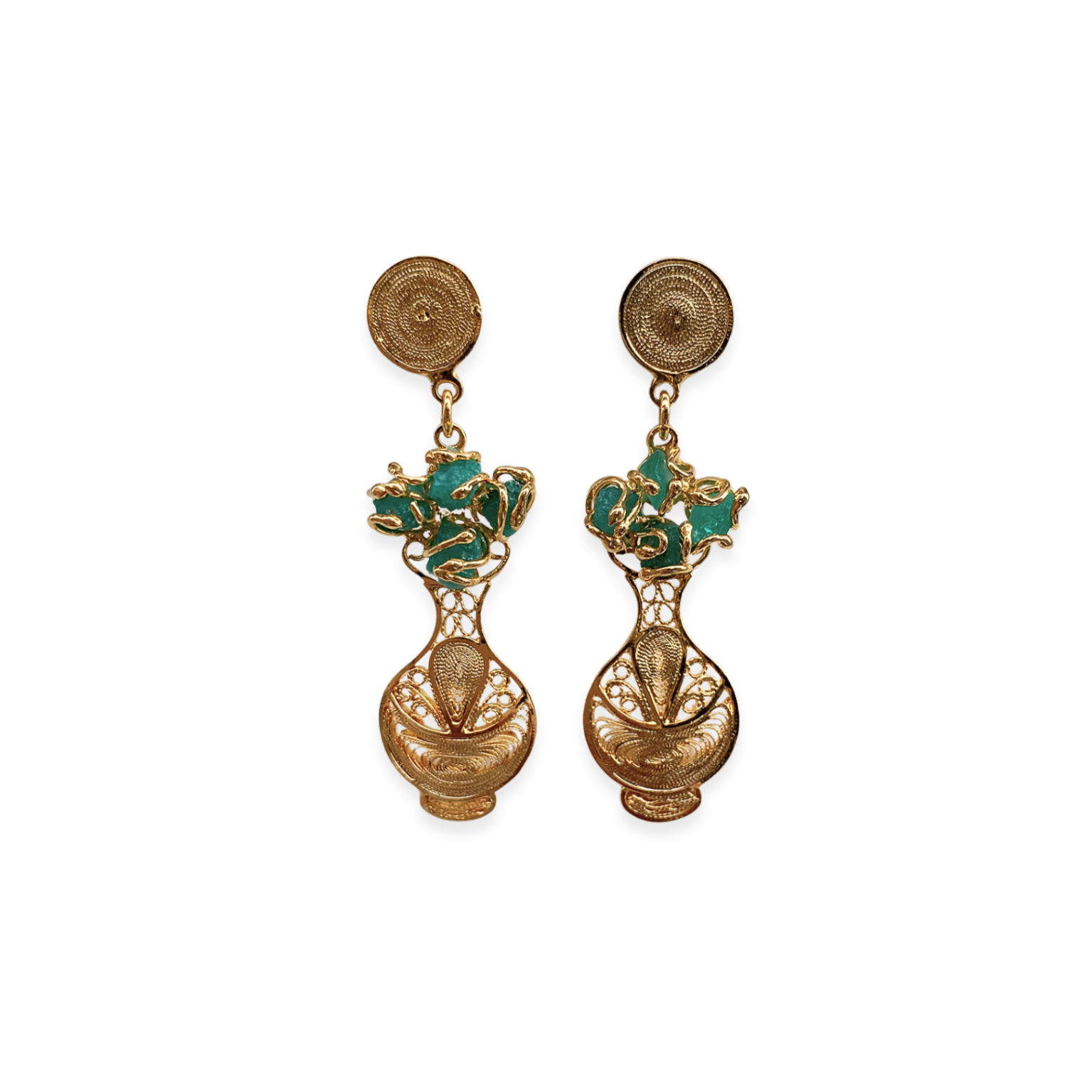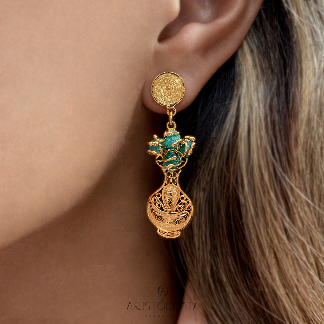 Arete tejido a mano técnica filigrana en plata ley 970 con enchape en oro solido 24k, tiene esmeraldas colombianas