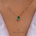 Dije elaborado en oro solido de 18k con una esmeralda colombiana corte lagrima 0.60 CT y diamantes 0.18 PT